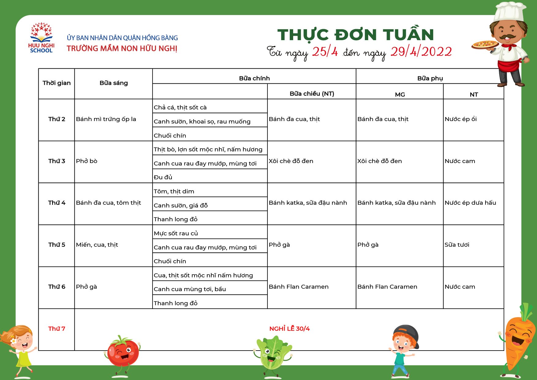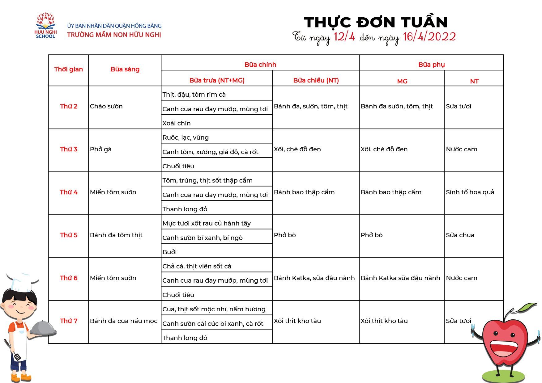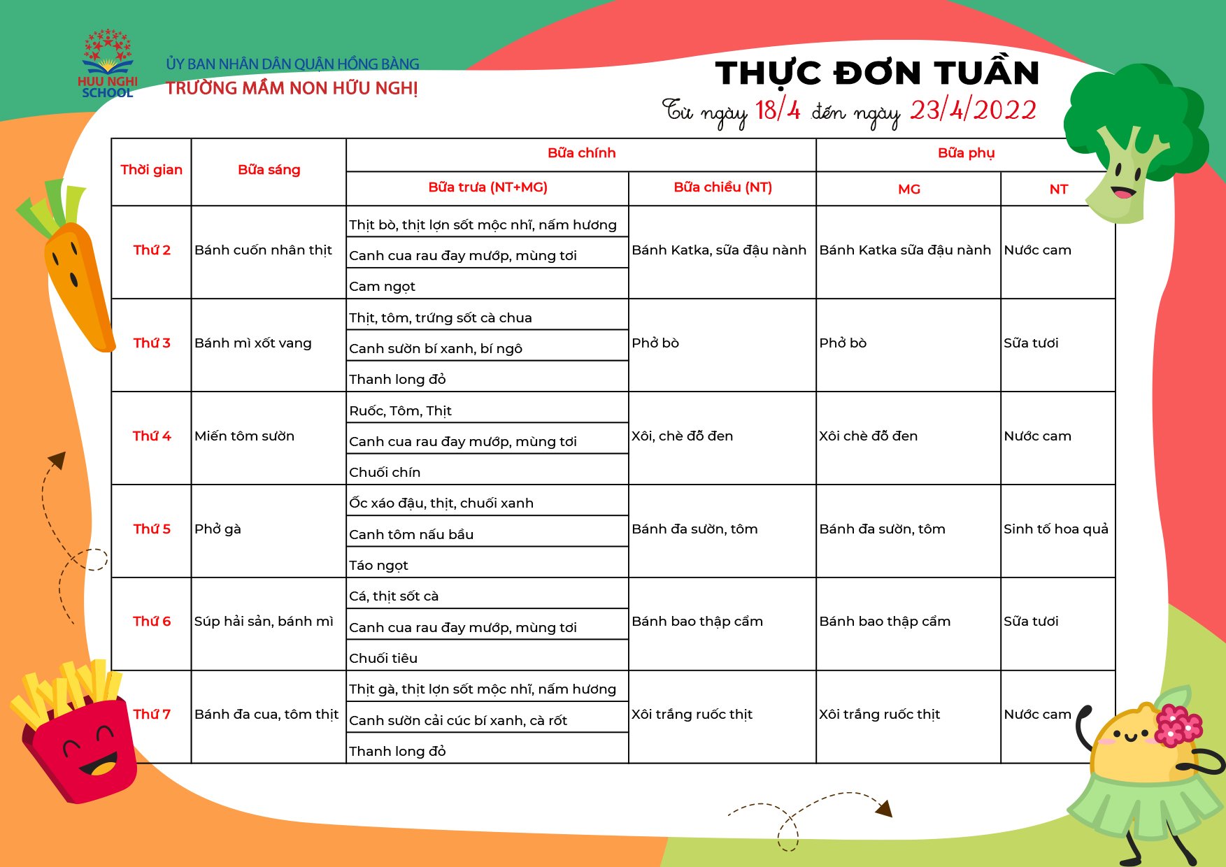 Thực đơn của toàn Hệ thống trường Hữu Nghị Quốc tế được các Chuyên gia Dinh dưỡng học đường chịu trách nhiệm chuyên trách đảm bảo chế độ dinh dưỡng đầy đủ năng lượng và vi chất cho học sinh theo từng độ tuổi. Thực đơn của Nhà trường cũng thường xuyên được thay đổi để đảm bảo sự phong phú cho học sinh.